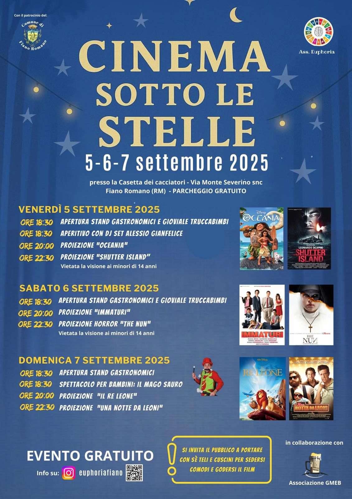Tre serate di cinema e intrattenimento all’aperto, che si terranno il 5, 6 e 7 settembre 2025 presso il Circolo dei Cacciatori Le Sasseta (Via Monte Severino, Fiano Romano – parcheggio gratuito).